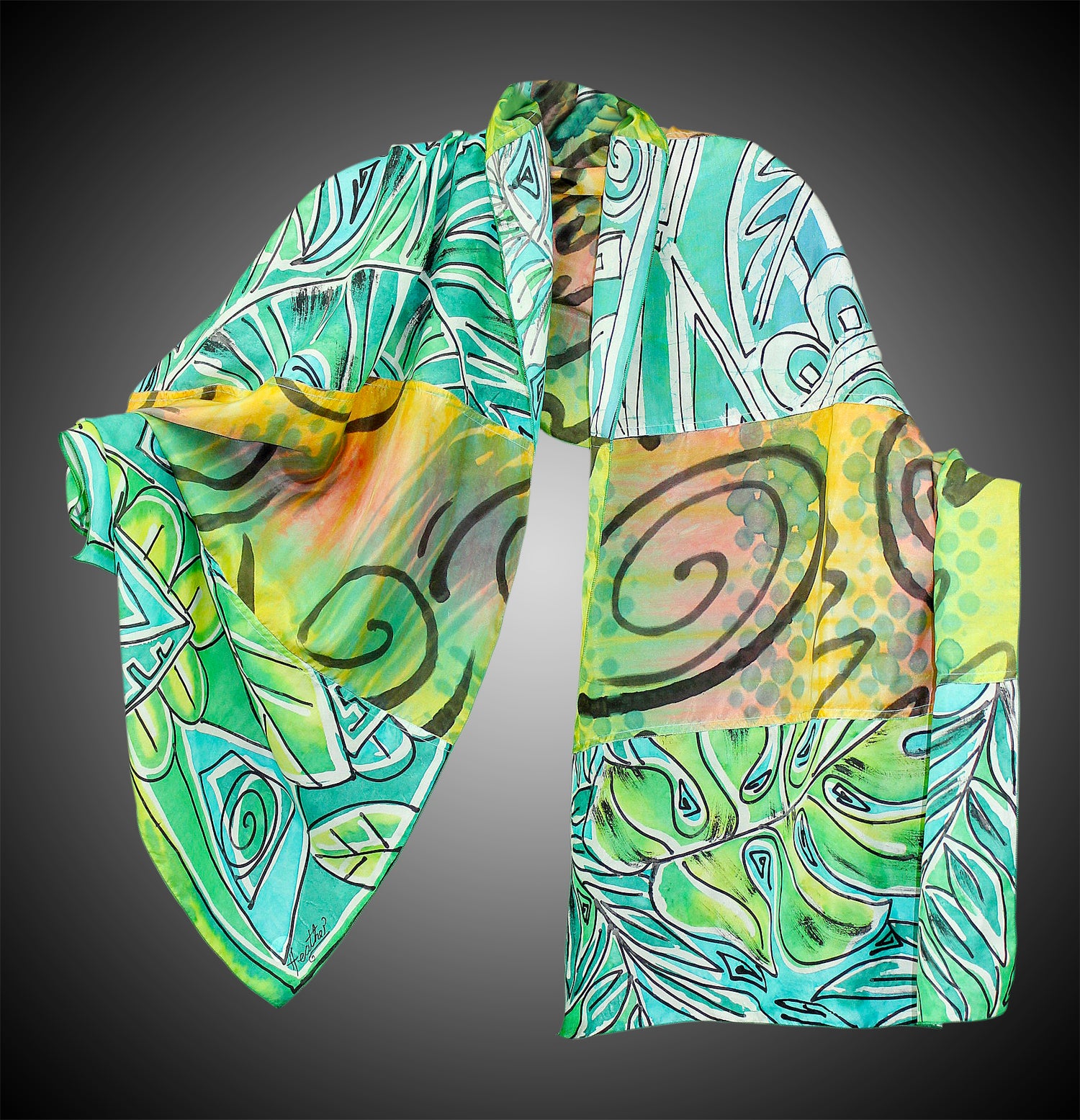 I hand paint natural fabrics with different methods, such as Batik, Shibori and watercolor applications, and then sew them into shawls and women’s tops. The Batik method is the application of melted wax, which resists dyes, resulting in the motifs and design. The wax is then removed by ironing, boiling and dry cleaning. Shibori and Tray Dying is a process of careful folding, pleating and scrunching during dye applications.